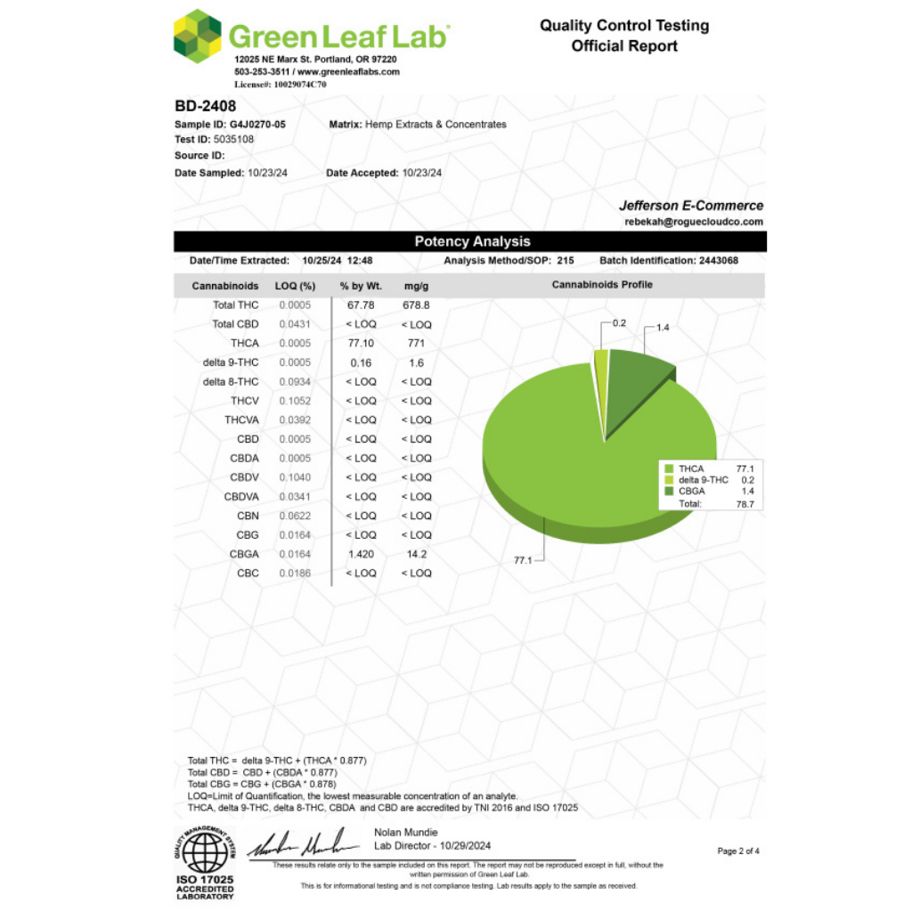 77.1% THCa, .0431% CBD, 0.016% CBG, 1.4% CBGa