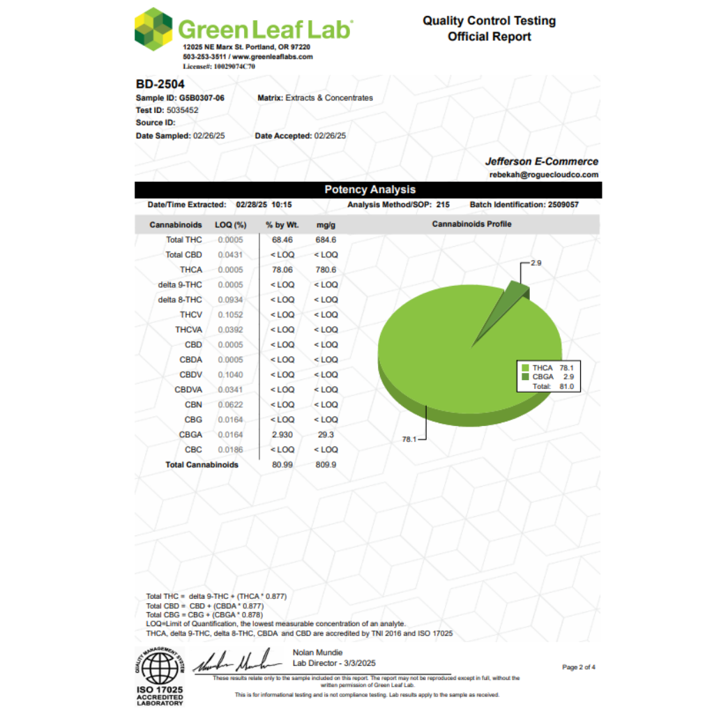 78.1% THCa, .0005% CBD, 0.016% CBG, 2.9% CBGa