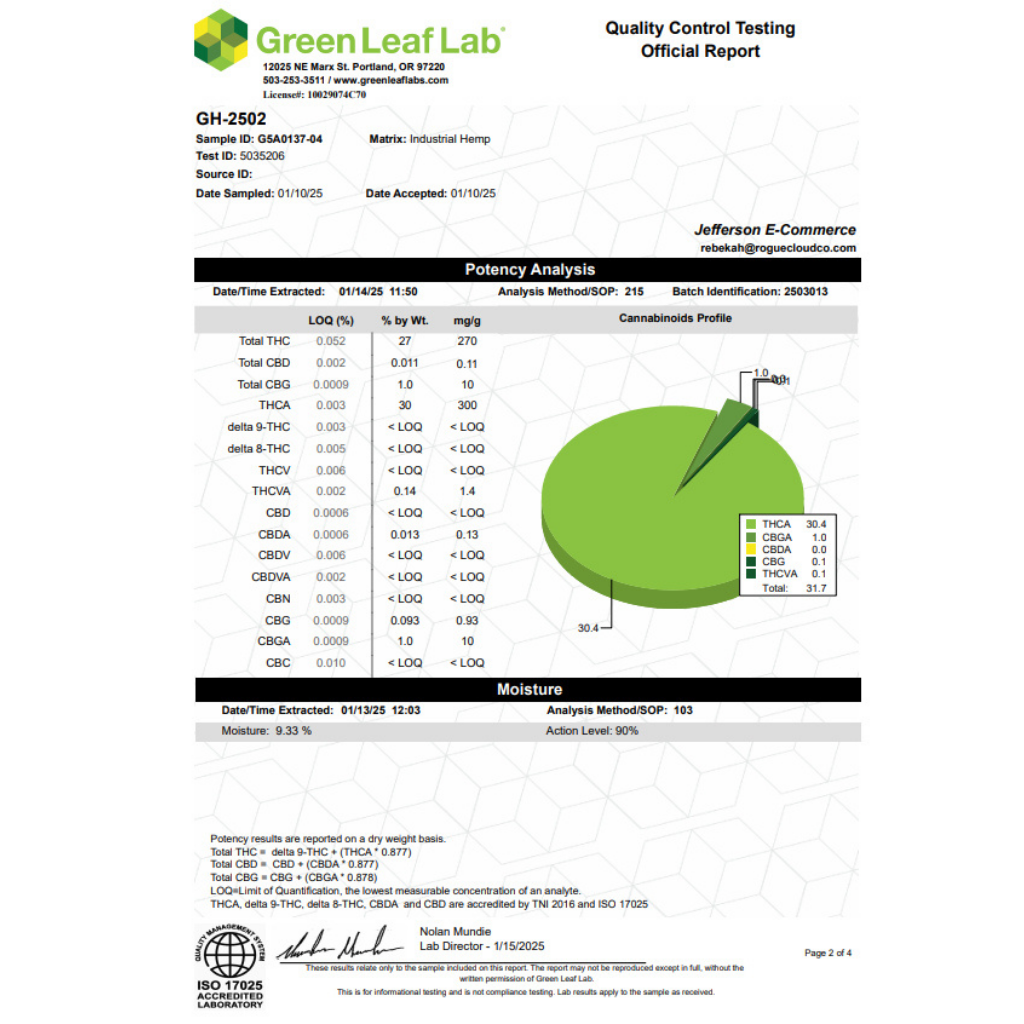 30.4% THCa, .011% CBD, 0.093% CBG, 1% CBGa